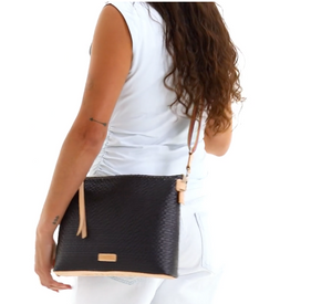 The Amy Downtown Crossbody blends texture with function in a roomy, take-everywhere design. With two interior pockets, a secure zip closure, and an adjustable strap, this pearlized woven bag keeps your essentials close while adding a polished finish to your day.