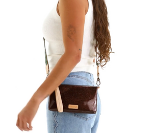 The Ember Uptown Crossbody was dreamt up as the stylish solution for carrying the essentials. With three zipper compartments, six card slots, and a detachable wristlet strap, this compact yet roomy bag is built to keep your necessities organized and close at hand. Its chocolate-toned glitter exterior makes it as eye-catching as it is functional.