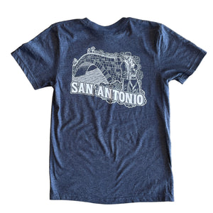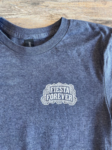 The Fiesta Forever Lovers at the Bridge shirt features a smaller pocket design on the front and a larger design on the back! The front has "Fiesta Forever" on top of a group of marigolds and the back features the story of two lovers transitioning from the living world to the ancestral world with "Viva San Antonio" below them! Based on the 2026 Fiesta Forever design this super soft shirt is available in navy blue with white ink!